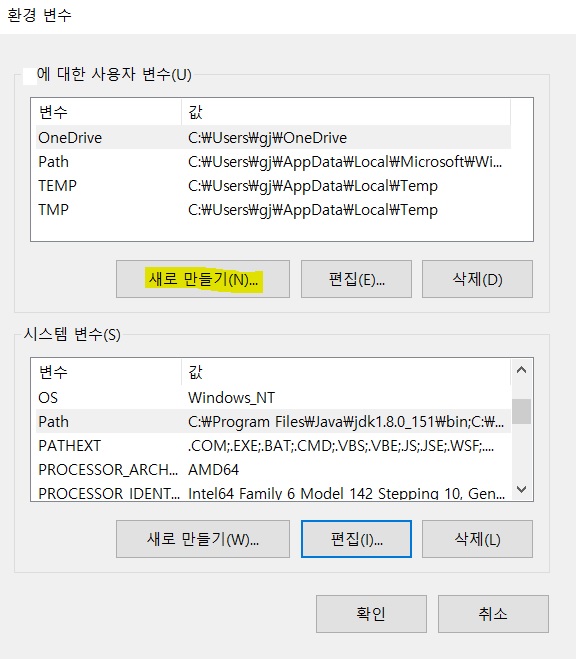 시스템 변수 위에 있는 사용자 변수 탭에서 새로 만들기를 눌러줍니다.