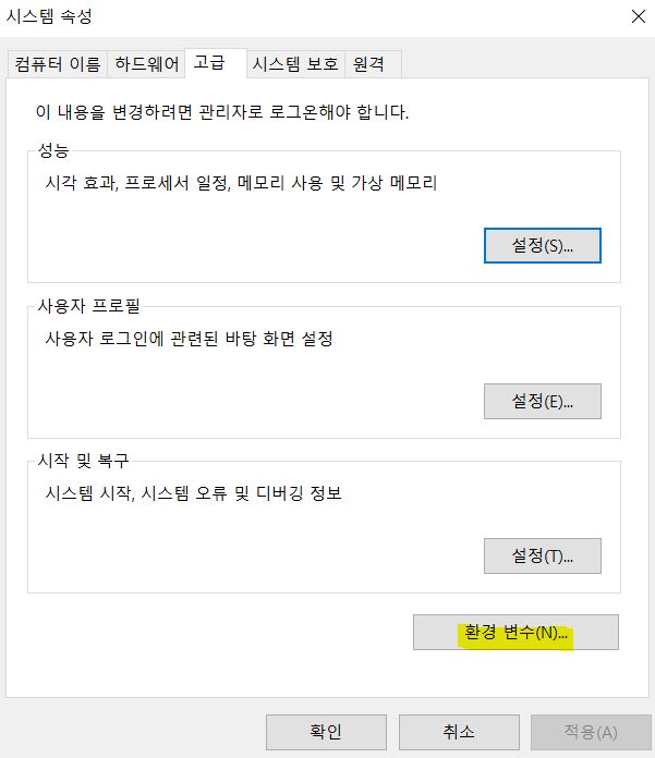 누르셨으면 고급 탭에 환경 변수를 눌러주세요.