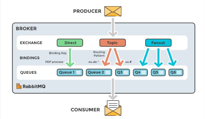 Direct Exchnage : Routing key와 일치하는 단일 Queue에 직접 전달. Routing key가 Queue의 Binding을 통해 Content(메시지)를 정확한 Queue로 전달.