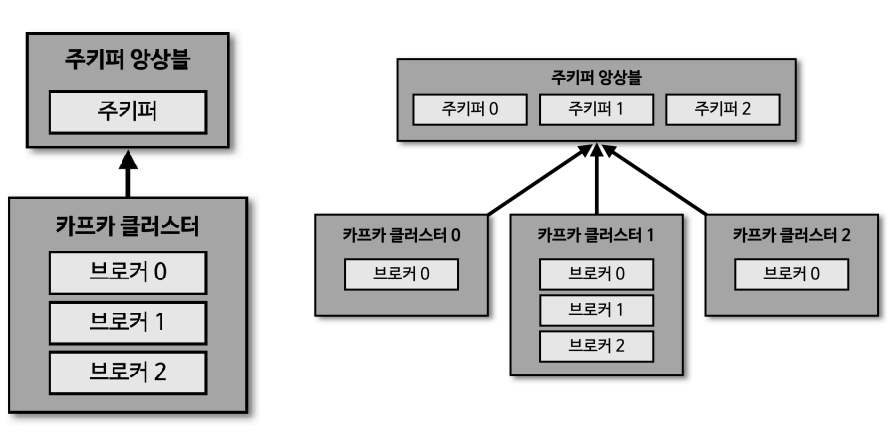 - 3개 이상의 브로커 서버를 1개의 클러스터로 묶어 운영