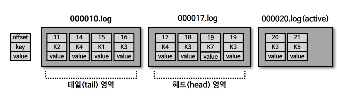 테일 영역: 압축 정책에 의해 압축이 완료된 레코드들, 클린 로그라고 부른다. 중복 메시지 키가 없다.