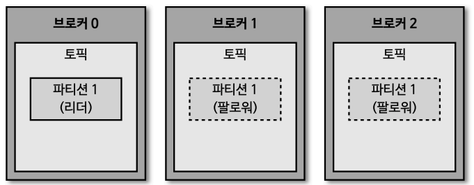카프카의 데이터 복제는 파티션 단위로 이루어진다. 토픽을 생성할 때 파티션의 복제 개수도 같이 설정되는데 직접 옵션을 선택하지 않으면 최솟값 1(복제 없음)이고 최댓값은 브로커 개수만큼 설정하여 사용할 수 있다.