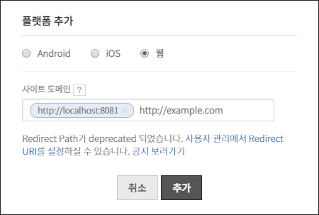 플랫폼 추가 클릭 > 웹